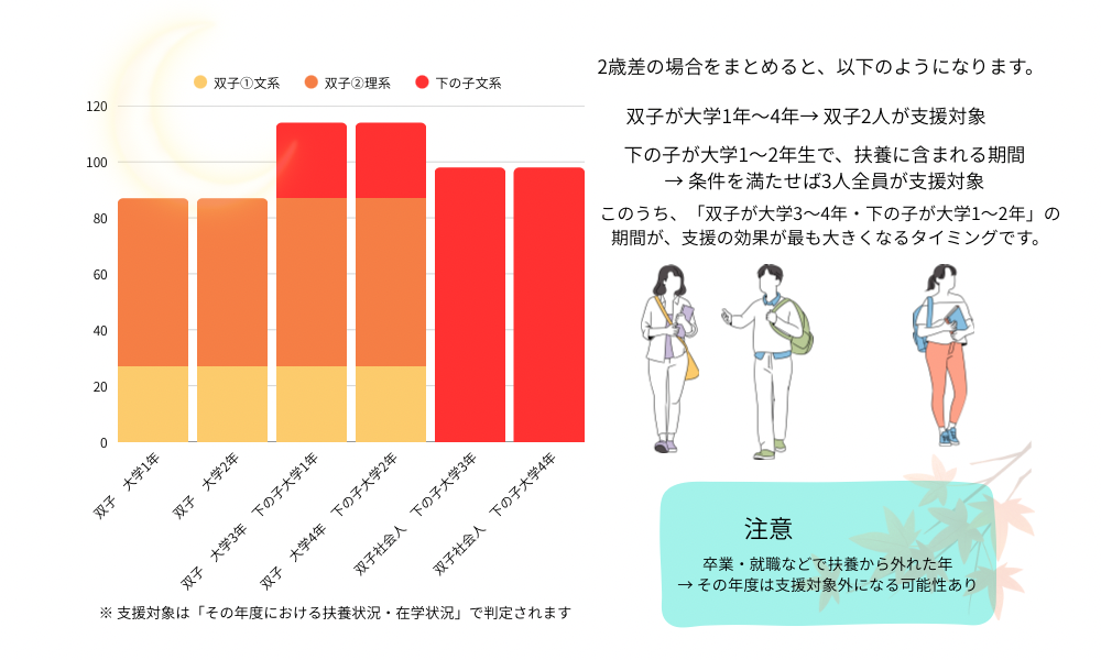 → 双子2人が支援対象 - 下の子が大学1〜2年生で、扶養に含まれる期間