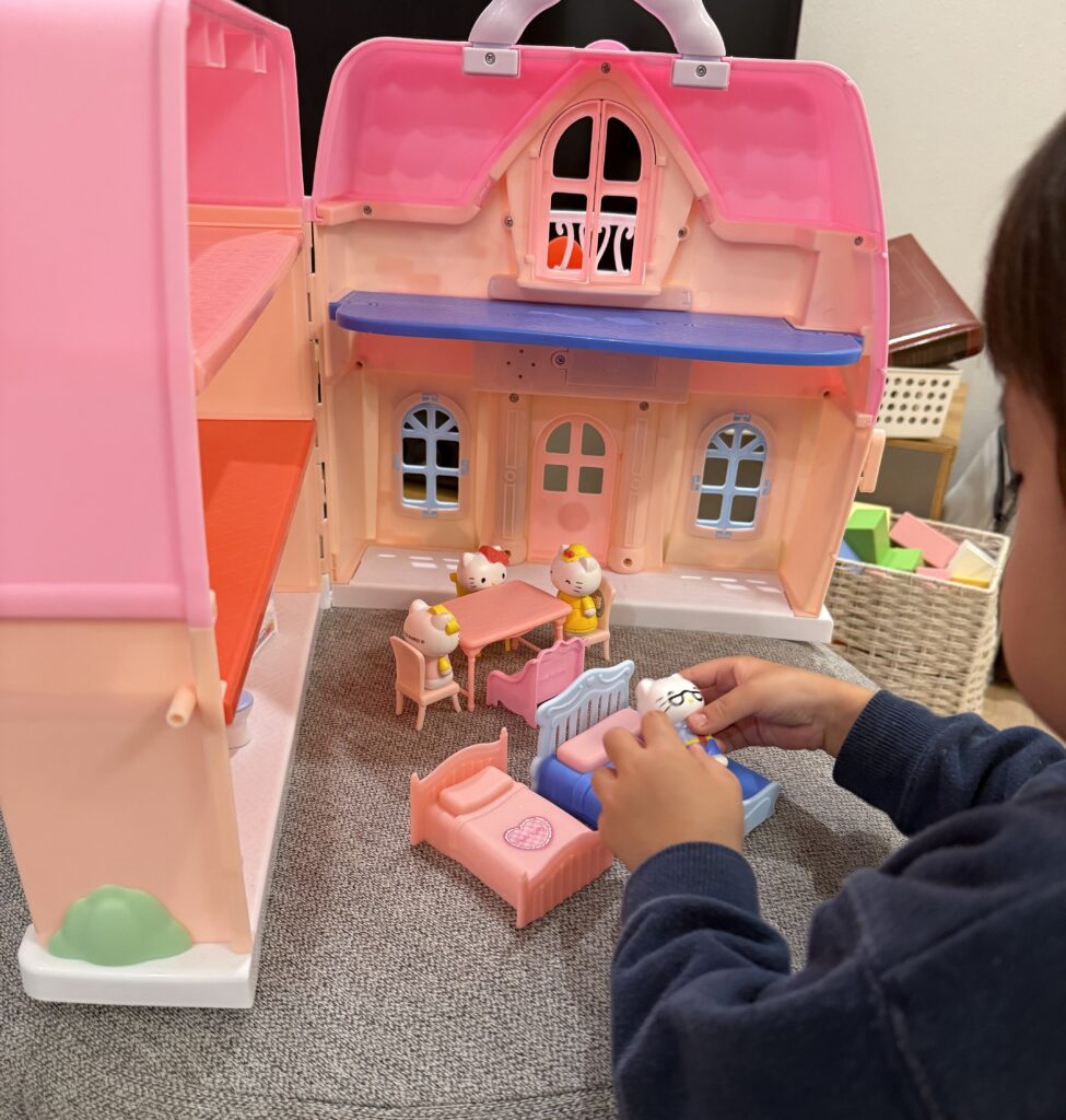 我が家はたまたまキティちゃんのドールハウスで気がついたきっかけです。お子さんの好きな人形やおもちゃなどで「ごっこ」遊びを取り入れてみましょう。