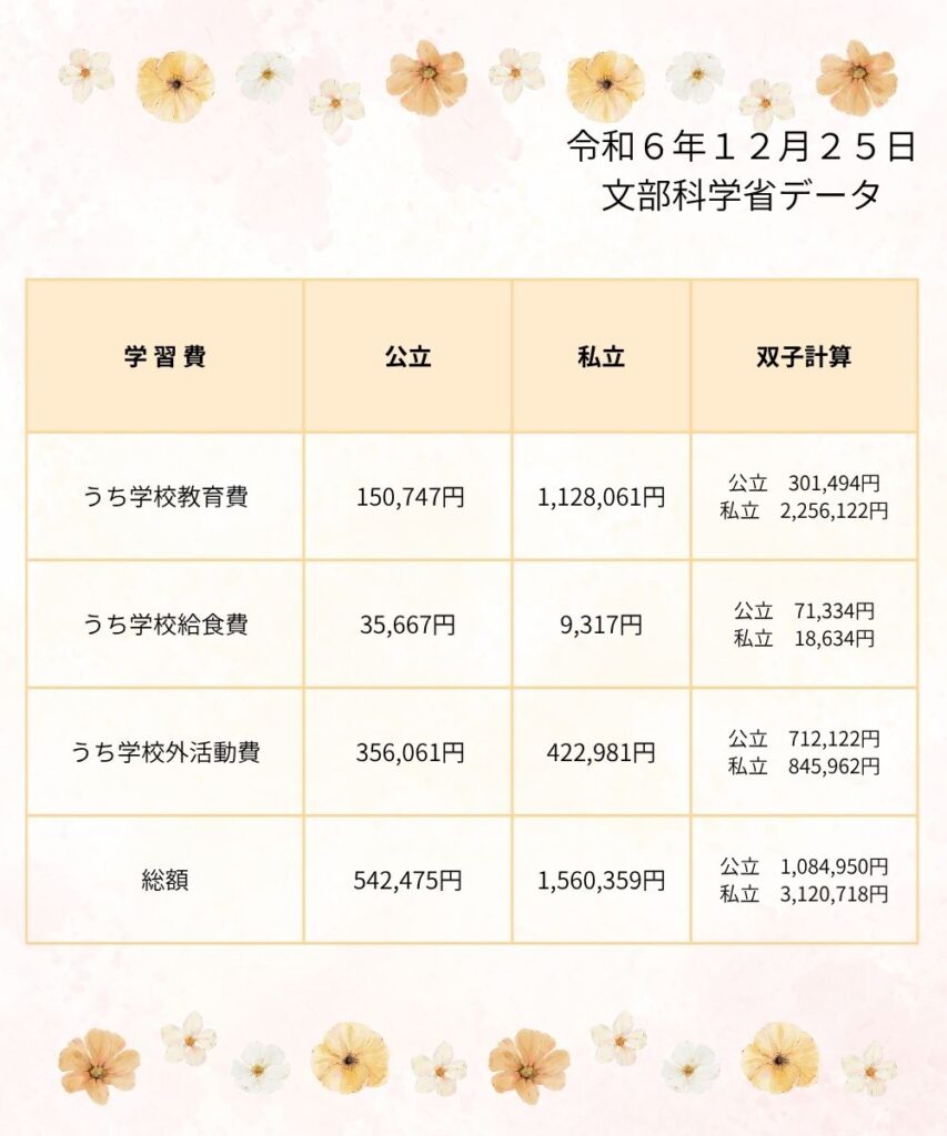 さらに小学校よりも+20万円ほど上がる理由 ↓公立小学校の教育費については下記にまとめています