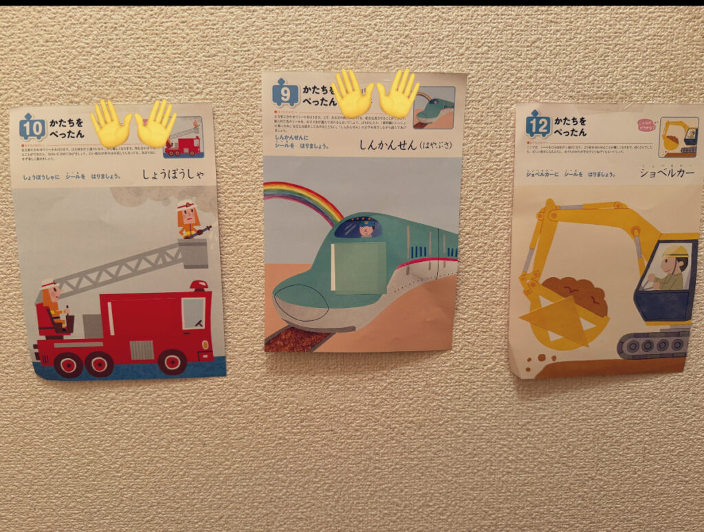 2歳の時より格段に理解度が高くなったので一枚にかかる時間がとても早くなりました。2人分、せっせとママが「次これ」と順番にシールを渡して貼ってもらうようにしているので、片方の待ち時間が生まれます。